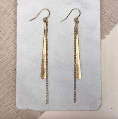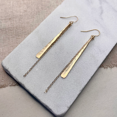 These simple everyday earrings catch the light beautifully as they hang. They feature a hand hammered stick with a length of chain. - Approx. 3.5" - Waterproof and sweat-proof. - Hypoallergenic, lead and nickel free. - Handmade in Portland, Oregon.