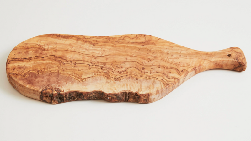 Presentation is everything, and these Italian Olivewood Boards help deliver the perfect presentation for charcuterie, cheese, desserts, and more. Featuring a natural rustic bark edge and a paddle handle for ease of holding and storage, this gorgeous handmade piece will be one you turn to any time you're entertaining. Due to the natural material and handcrafted nature of this product, the size and shape of each piece will have slight variations.No two are exactly alike. CARE: Hand wash only, occasionally coat with olive oil or mineral oil to keep wood looking its best.
