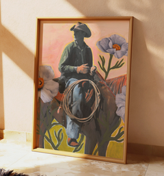 Add a touch of rustic charm to your living room with this Retro Rodeo Cowboy Collage Poster. The vintage western painting features poppy wildflowers, bringing a neutral and calming vibe to any space. Perfect for adding a bold statement to your walls.